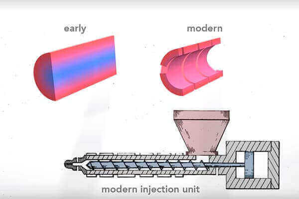The solution was this: the reciprocating screw. Often regarded as the “most important contribution that revolutionized the plastic industry in 20th century.” In the earlier plunger-style machine plastic filled completely the cylindrical barrel, but the plastic was not at a uniform temperature. The reciprocating screw overcomes this in three ways.